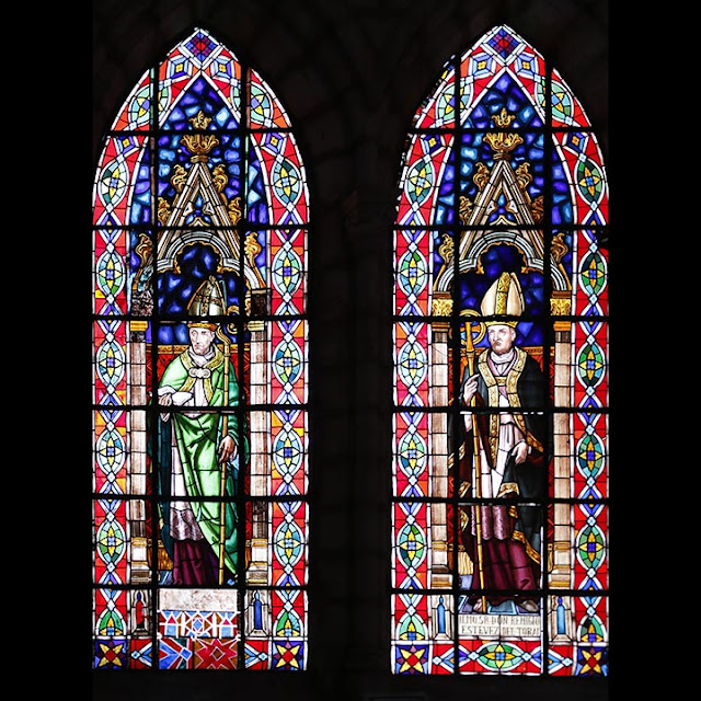 Inside is quite plain but has lovely painted, not stained, glass windows.